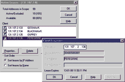 DHCP позволяет легко определить, какой машине какой адрес назначен. В диалоге DHCP Manager (показанном на экране 1), выберите Scope, затем Active Leases. Для получения подробной информации о сроке аренды адреса для каждой из машин, выберите ее и нажмите Properties (или два раза щелкните на имени машины). На экране 4 показан список компьютеров моей офисной сети. Уникальный идентификатор (например, 004005000001) - это MAC-адрес сетевой платы. При необходимости отключить компьютер от сети, или после того как одна из машин была из нее удалена, соответствующий срок аренды можно аннулировать.